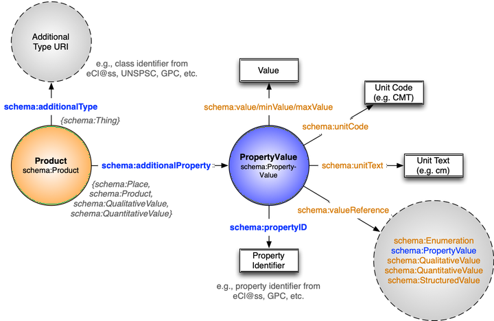 Product classification standards like eCl@ss and UNSPSC define tens of thousands of product categories, and some standards additionally provide specific product property definitions and enumerated values. Many organizations hold respective meta-data for their products readily available in back-end databases. While many approaches have been presented for using such standards for more granular product information on the Web of Data, none has so far received mainstream adoption. This can be partly explained by legal, technical, and administrative barriers for adoption. In this paper, we describe a novel approach for using product classification standards in Web data markup in Microdata and JSON-LD syntax that does not require the availability of proper Web ontology variants of the underlying standards. We can show that the approach can provide the very same effect for the consumption and interpretation of the resulting mark-up in a Linked Data and Semantic Web context. Our proposal has already been integrated into the official version of schema.org and can be readily used for research and business applications.